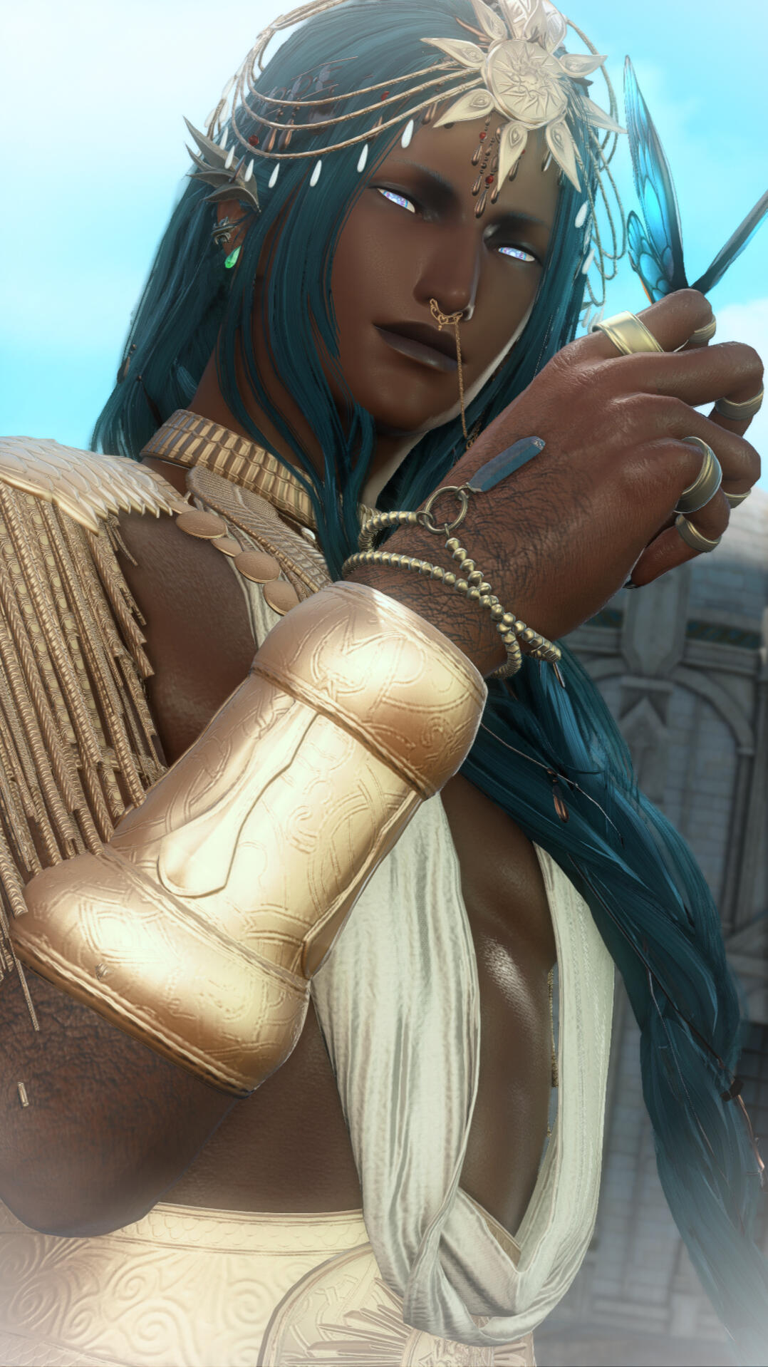 "TO KNOW OF HUÁKINTHOS is to know of his tenure at the Akadaemia Anyder, beloved of those grand halls as the advisee of Headmaster Akhelôios—a scholar beholden to their wanderlust who would see their advisement transferred to the august hands of the premier scholar of creation magicks, Lahabrea."To know of Huákinthos is to know of their own wanderlusts, an inheritance that the Convocation sought to give purpose with the august mantle set upon his shoulders. To walk among the people of Etheriys and offer them succor and shield against the travails of the star—in his footfalls are mercies. A man beloved of the star without, unflinching before his duty to safeguard the mysteries of his precious home."To know of Huákinthos is perhaps to know of his creations—the kuanéos calculations and their startling intricacy, the pioneering geōmetríā that would capture the color of the sky upon the wings of a petaloúda, released to dance upon Elpis's zephyrs. Perhaps 'tis the signature color of his magic in truth, the azure light stretched as a gossamer veil to shield against the most grievous blows."Yet to know Huákinthos is to hear the dulcet simmer of his voice near the end of day, to know that heart-sad music singing the fulgent light to his beloved west, to the shores of a pearl hewn shimmering from the cliffside."To know Huákinthos is to taste the wine sticky upon his lips merely by sight, to feel his eyes linger upon your own. To witness a tawny shoulder or a errant curl peeking from his robes, the flush of mirth at the edges of his mask. To hear your name in his mouth, sweet as golden honey."To know Huákinthos is to witness the opals spun bright at his eyes when you light on a topic of interest. To see him fold his gilded hands, set his face upon them, and smile as though he has heard the star's greatest secret."